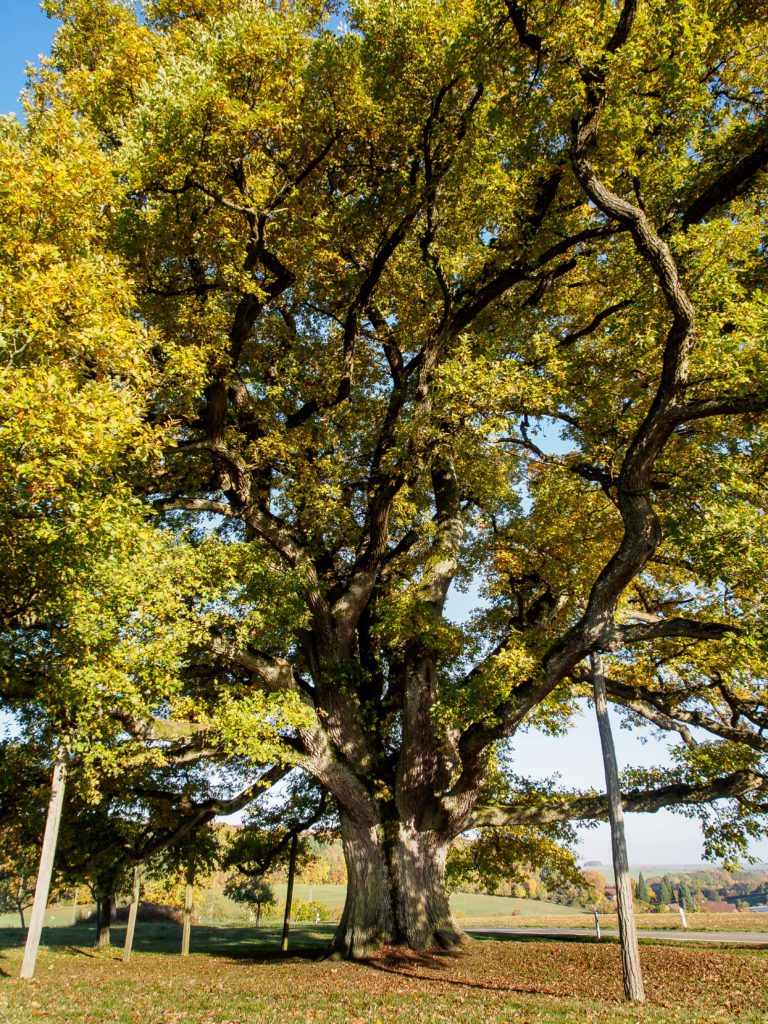 Trotz seines sehr gleichmäßigen Wuchses in alle Himmelsrichtungen bietet die Eiche bei genauerem hinschauen sehr unterschiedliche Perspektiven und ist keineswegs so monoton wie es von Weitem scheint. Jeder Ast schreibt seine eigene Geschichte und bei jedem Besuch zeigt mir der Baum ein neues Gesicht. Licht, Blickwinkel, Horizont, Standort, Wetter, Jahreszeit, Wiesenblüte oder Laub bedeckter Boden,… – eine Vielzahl an Faktoren sorgen dafür, dass es einem nie langweilig wird.