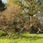 Beim ersten Blick direkt vorm Baum stehend fallen einem die zwei tiefen, mächtigen und ausladenden Hauptäste auf. Einer berührt bereits mehr oder weniger freiwillig den Boden. Er ist nicht abgebrochen, aber aufgebrochen. Ob das wohl auch auf die auf den Ästen schaukelnden Kinder und Erwachsenen zurückzuführen ist? Vor Ort konnten wir das zumindest gleich bei der Ankunft beobachten und auch die Gemeinde beschäftigt sich wie man im Internet lesen kann schon länger mit dem Problem… Vielleicht schaftt der Baum an der Stelle wo er den Boden berührt sogar eine Verjüngung. Ein dritter mächtiger und tiefer Hauptast ist bereits seit einiger Zeit abgebrochen. Dies kann man unschwer an dem doch schon weiter fortgeschrittenen Zersetzungsprozess sehen.