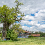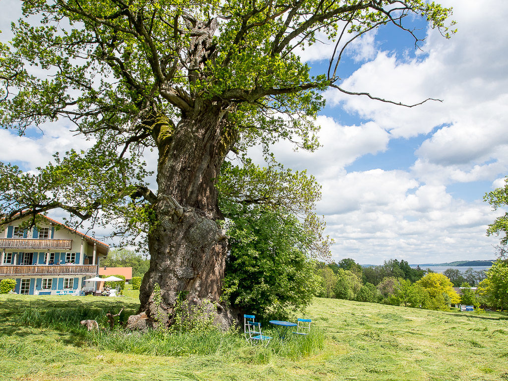 Am Hofgut bei Bernried, auf einer Anhöhe mit direkten Blick auf den Starnberger See, befindet sich eine sehr schöne alte Huteeiche. Die Stieleiche (Quercus robur) hat einen Brusthöhendurchmesser von ~2,64 m bei einem Umfang von ~8,3 m und einer Höhe von 16 m. Zahlreich wird Sie als eine der tausendjährigen Eichen bezeichnet, allerdings ist selten ein Alter über 600 Jahre anzunehmen. Das Alter dieser Huteeiche wird von mehreren Experten auf 350-500 Jahren datiert. Der knorrige Stamm zeigt zahlreiche Wucherungen und über die Jahre scheint die Eiche schon einiges mitgemacht zu haben. So befindet sich die Krone augenscheinlich in der Rückzugsphase und es sind nur noch wenige mächtige Äste und einiges Totholz verblieben. Umringt vom Starnberger See, dem schönen Hofgut und der frischen Hofwiese fügt sich die Eiche von allen Seiten herrlich ins Landschaftsbild ein. Der Baummethusalem wird wohl von der jüngeren Nachbareiche vor Blitzschlag geschützt. Die Eiche befindet sich auf einem ganz besonderen Flecken, umgeben von den Resten einer mittelalterlichen Weidelandschaft reich an alten Eichen und Buchen. So wurde die Fahrt durch diese wunderschön Landschaft zu einer ganz besonderen Freude.