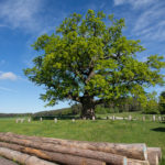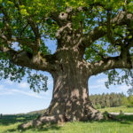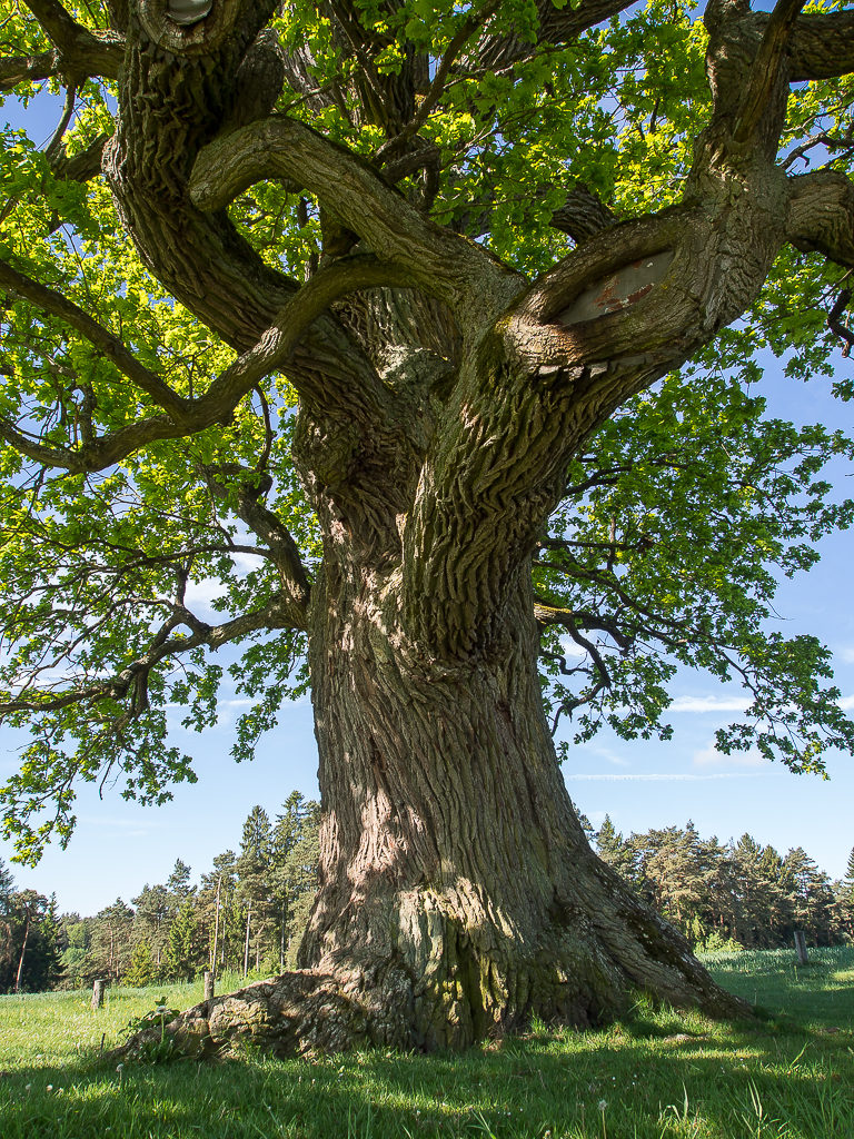 An einem schönen Tag im Mai legten wir auf dem Weg nach Nürnberg eine kleine Verweilpause an der alten Kreuzeiche von Hürbel am Rangen ein. Mein Begleiter Ulrich durfte dabei gleich als Maßstab in die Rolle des Statisten schlüpfen. Über den Baum wurde schon viel berichtet. Der Bayrische Rundfunk hat sogar eine kleine nette Reportage über die alte Eiche gedreht. Einige der Geschichten möchte ich euch nicht vorenthalten.